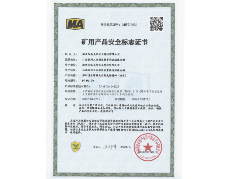 煤矿加固煤岩体用聚氨酯材料安标证书